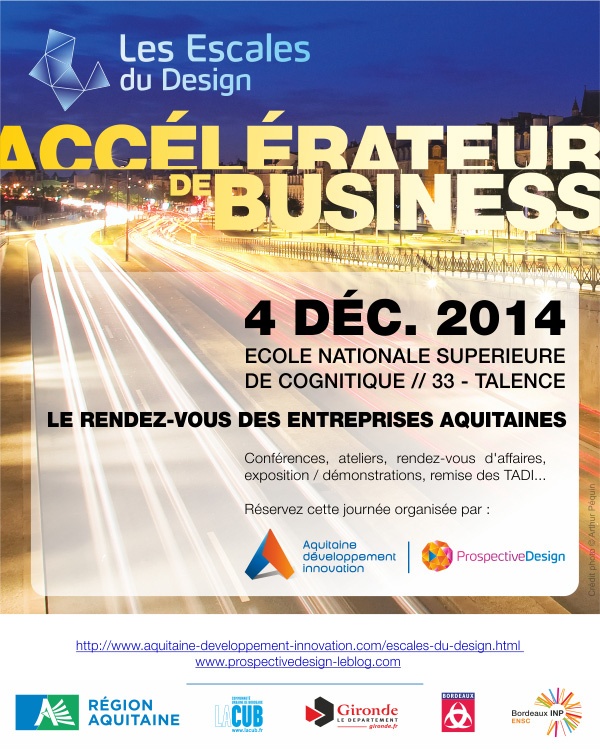 Avec toujours la même volonté de créer un carrefour de rencontres et d'informations autour du design, le département Prospective Design d’Aquitaine Développement Innovation vous convie à la 4e édition des Escales du Design.