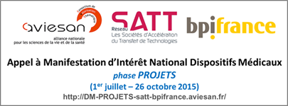 Si vous êtes une équipe académique (organisme de recherche ou établissement de santé) ou un industriel et souhaitez soumettre un projet de dispositif médical, rendez-vous sur http://DM-PROJETS-satt-bpifrance.aviesan.fr (ouvert du 1er juillet 2015 au 26 octobre 2015 minuit).