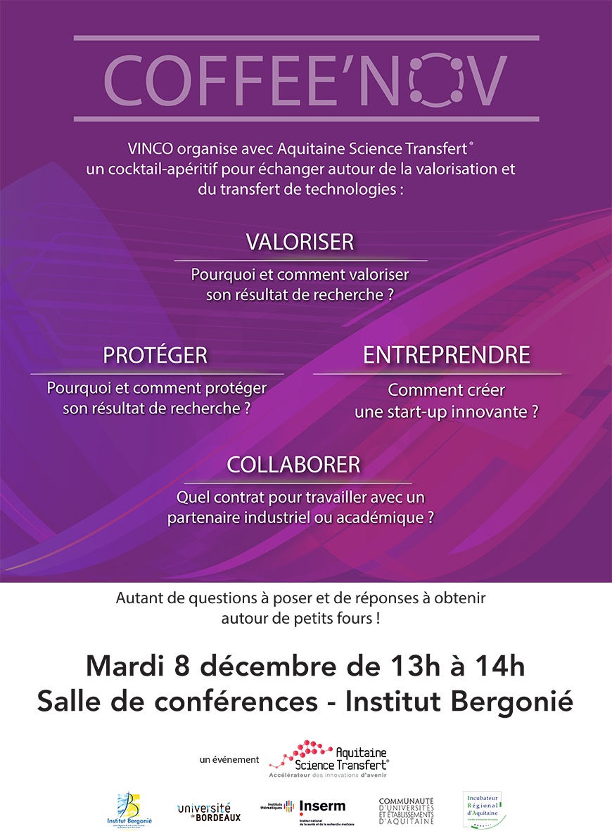 Le laboratoire VINCO organise le mardi 8 décembre de 13h à 14h, un cocktail-apéritif pour parler de la valorisation et du transfert de technologies avec Aquitaine Science Transfert.