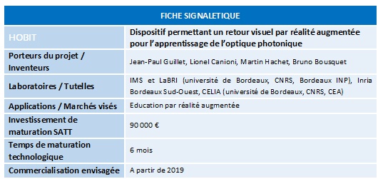 Le projet HOBIT (Hybrid Optical Bench for Interactive Teaching), porté par des chercheurs de l’université de Bordeaux et d’Inria (Institut national de recherche en sciences du numérique), vise à faciliter l’apprentissage de l’optique photonique laser. En associant la simulation et la réalité augmentée, HOBIT permet d’acquérir la compréhension des phénomènes physiques, la technicité des gestes, tout en visualisant les résultats d’expériences. La réalisation de travaux pratiques est ainsi grandement facilitée : elle devient visuelle, moins coûteuse et sans danger lié à l’utilisation de lasers.